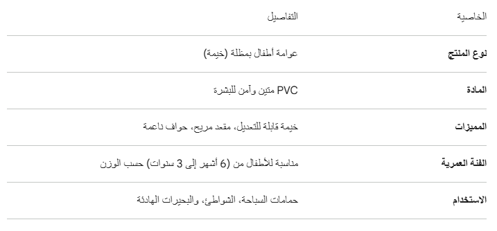 ج.مهل تخططين ليوم رائع على الشاطئ أو بجانب المسبح وتقلقين من أشعة الشمس القوية على بشرة طفلك؟ عوامة الأطفال المزودة بخيمة هي رفيقك المثالي هذا الصيف. صُممت هذه العوامة خصيصاً لتمنح طفلك تجربة مائية ممتعة وآمنة تماماً، حيث توفر المظلة المدمجة ظلاً يحمي بشرته الحساسة من الأشعة فوق البنفسجية، بينما يضمن التصميم المتين ثباته وتوازنه في الماء، لتقضي وقتاً ممتعاً وأنتِ مطمئنة تماماً.